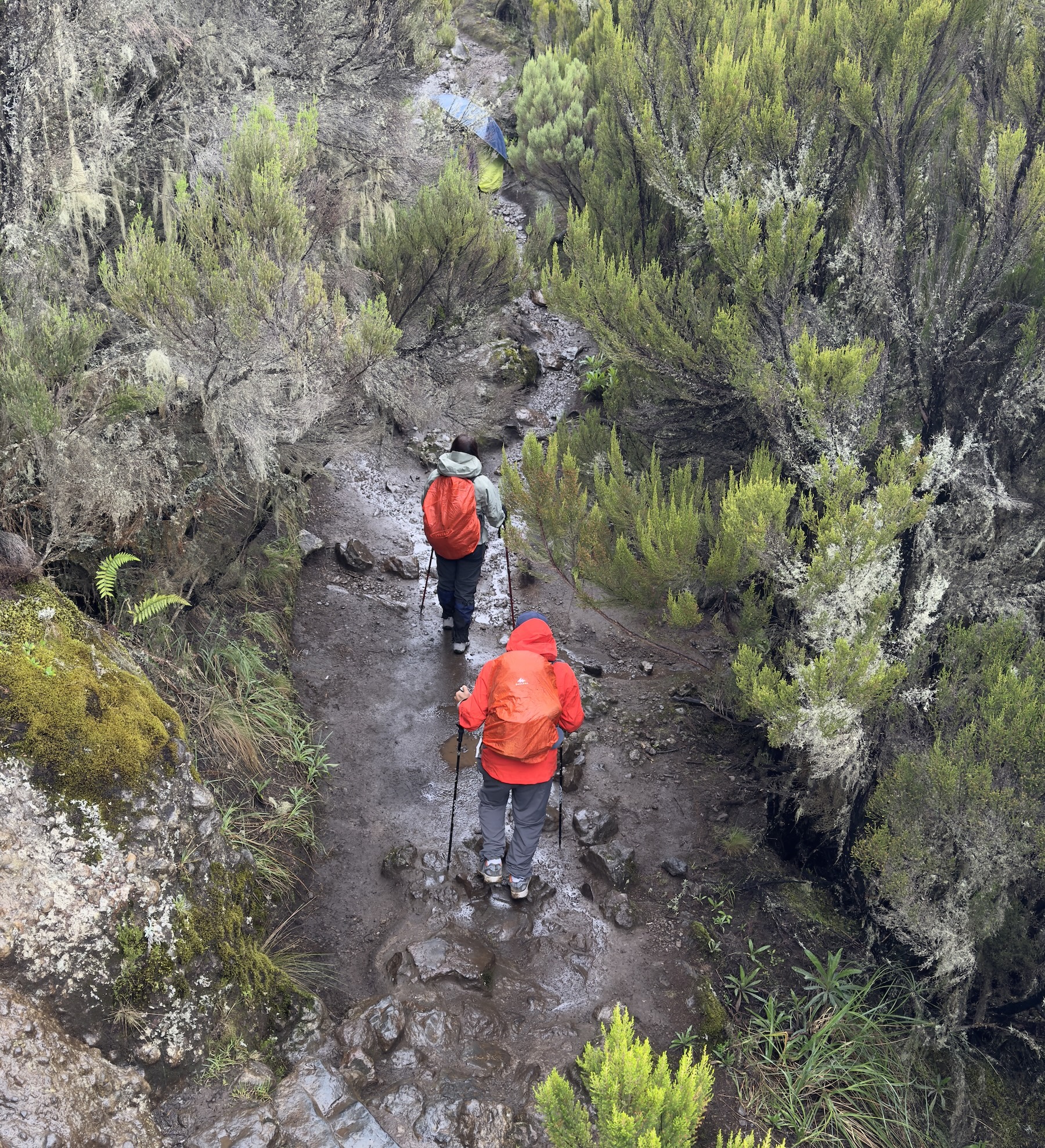 الارتفاع: 3,100م → 1,640م المسافة: 10 كم المدة: 3–4 ساعات التضاريس: غابات مطيرة النزول الأخير عبر الغابات. استلام شهادة القمة والعودة إلى موشي.